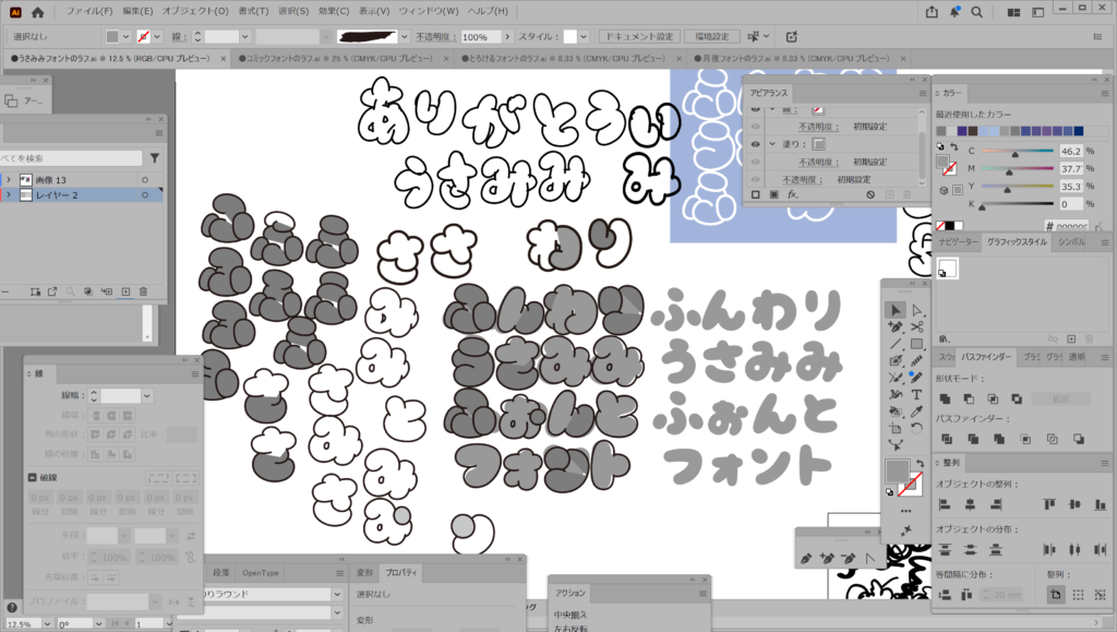 あとライブペイントツールで塗りをつくってフォントにするつもりだったけど、線も要るのかな。それかアピアランスで外側だけ太い線の付け方の解説がいるかも?(ドーナツ穴のあるオブジェクトは、追加塗りにパスファインダ合体をいれて、さらに線追加で外側だけに縁取りできる)。字間のくい込みのアピアランスがあるか後で調べる。