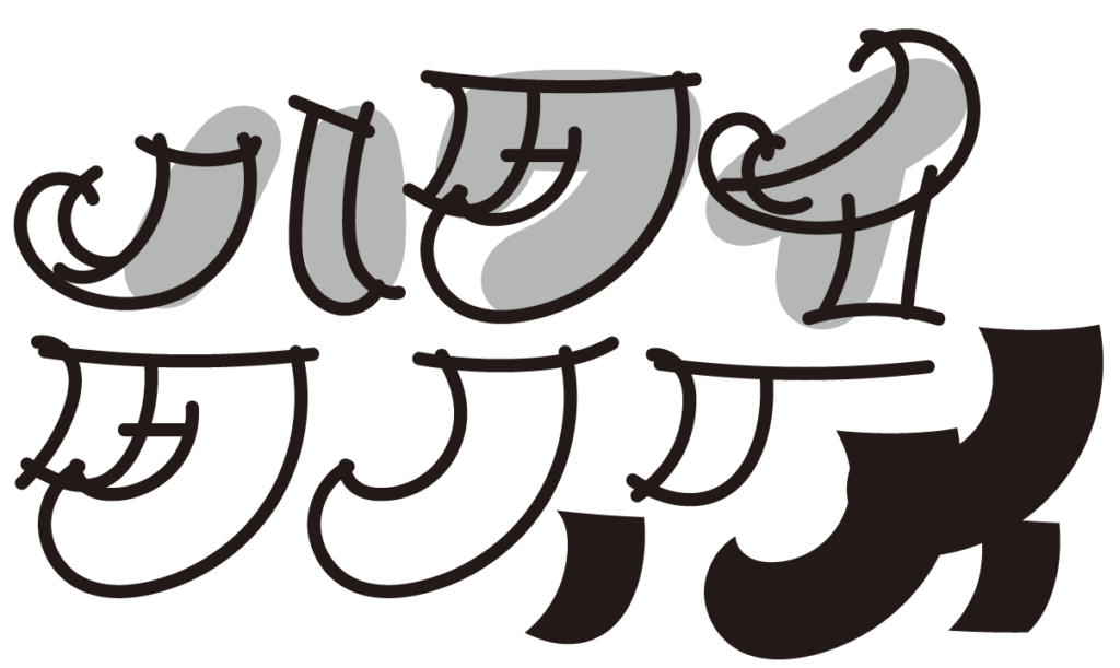 次のフォントのアイデア出し4(コミック的)を続けて、強めの払いのある文字もやってみた。