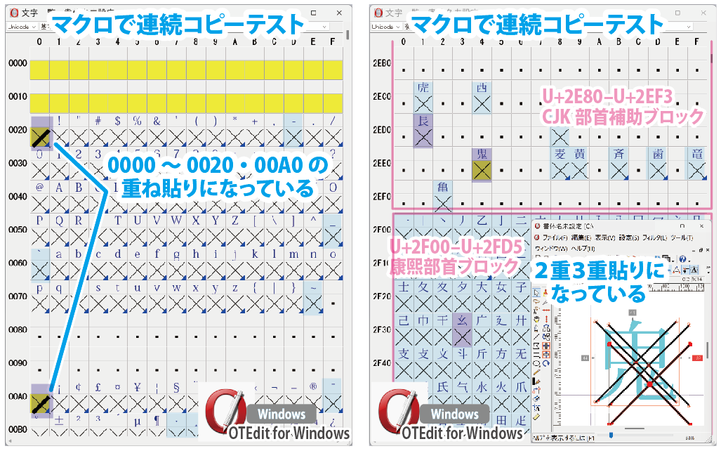 実験用マクロでUnicode全文字(0000~FFFF)に連続コピーペースト。0000~0019分の処理が、0020半角スペースに累積でペーストされています。同一CIDとして3連動の「鬼」なども選択してずらすと多重貼りになっているのが分かる。(ペーストはOTEditの仕様でわずかにズレが付与されて完全同一座標にならない工夫がされています。)