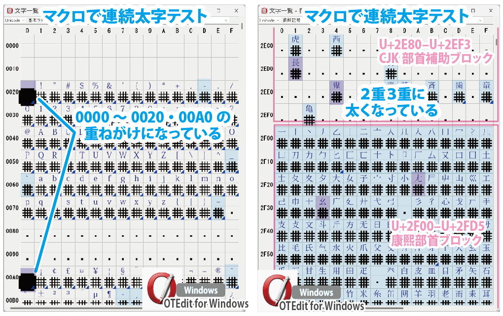 OTEdit for Windows用のマクロでUnicodeで連番処理していくと、CIDにまとめられた連動文字は別のコードとして複数回開かれます。これは正しく動いているといえますが、コピーや太字では連動文字部分が2回・3回の効果の多重がけになり、困ったことになります。※OTEdit for Macにはマクロはありません。