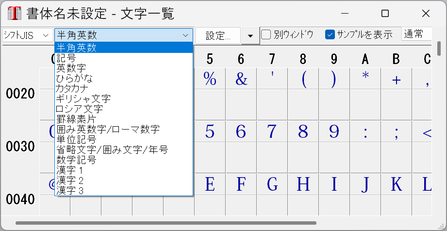 『シフトJIS』では「漢字1・漢字2・漢字3」のカテゴリ表示ができますが、内容は第一水準漢字・第二水準漢字・IBM拡張漢字です。(参考:Wikipedia IBM拡張漢字)『Unicode』では「CJK統合漢字」カテゴリに漢字が全部まとまってしまっています。