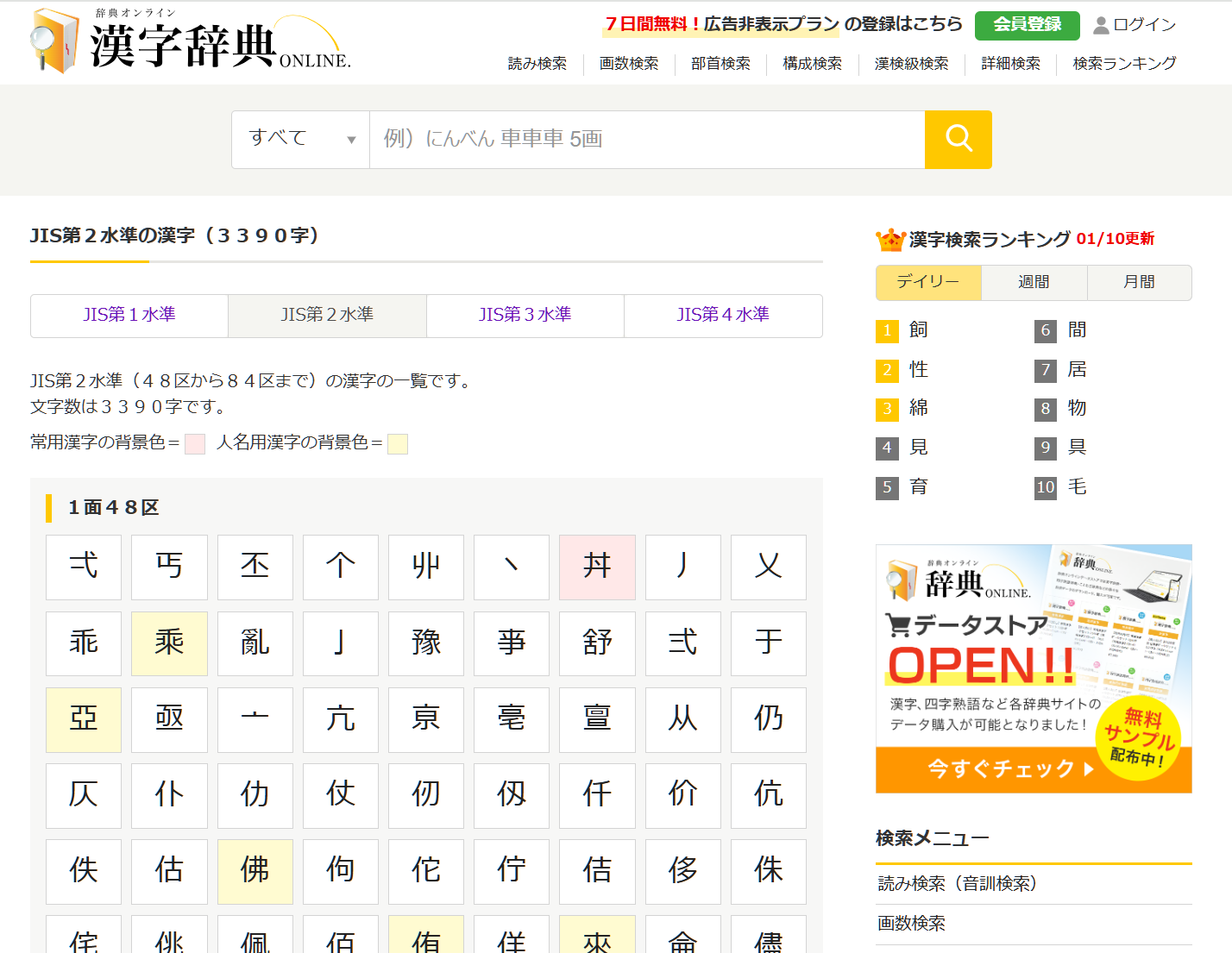 【参考】漢字辞典オンライン:JIS第2水準の漢字(3390字)