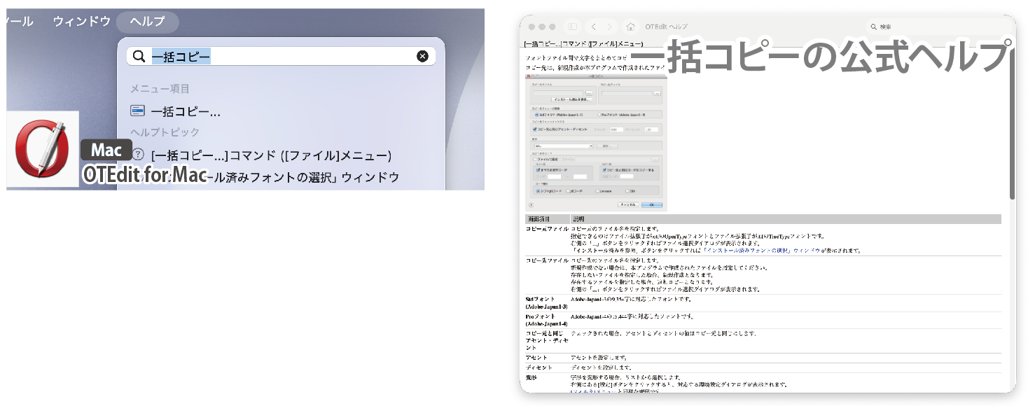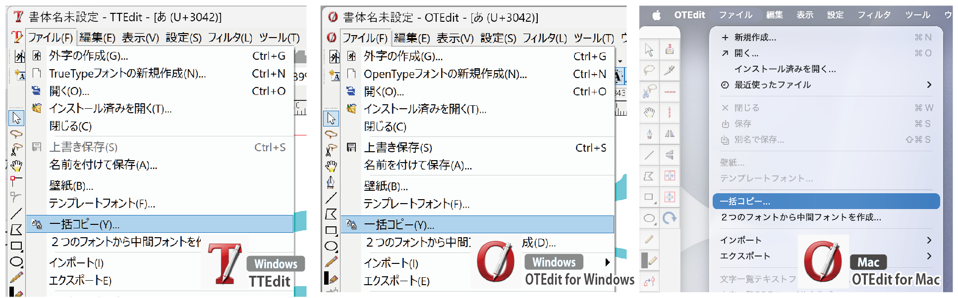 ・コピー元/コピー先の両方閉じて実行するのが悩まなくて楽です。OTEditが起動していれば、フォントファイルを開いていなくても「一括コピー」は動作します。コピー先ファイルは閉じていないと実行できません。