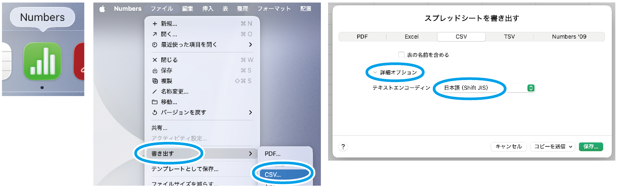 ・『Numbers』で編集:「ファイル」→「保存」は「~~~.numbers」で保存されてしまうためNG。「ファイル」→「書き出す」→「CSV」、詳細オプション:テキストエンコーディング「日本語(Shift JIS)」で.csv保存。