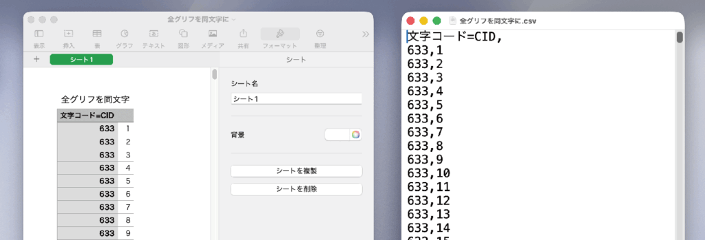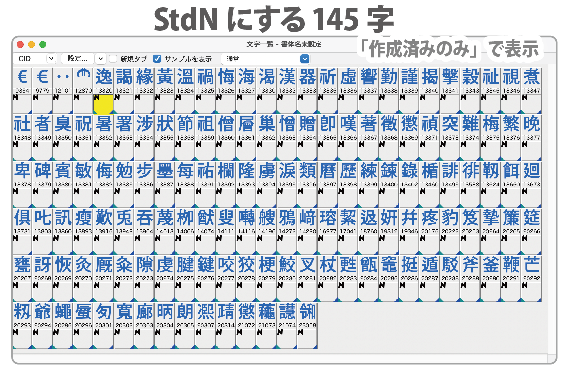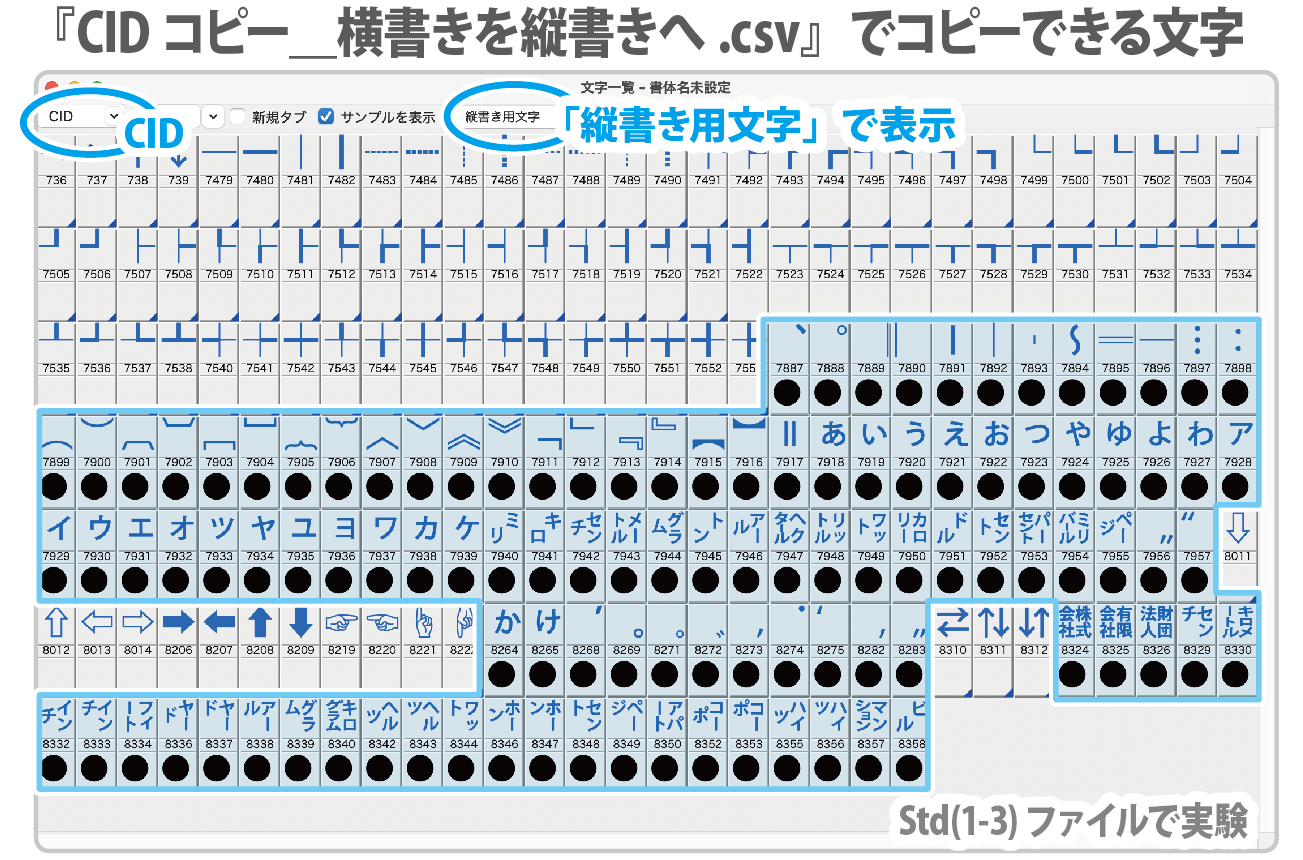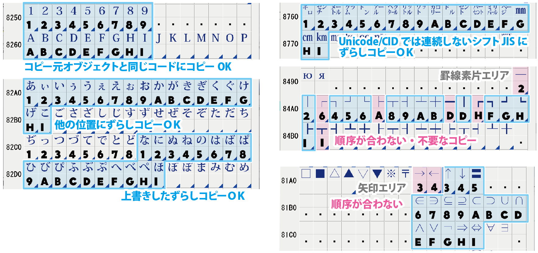 ※シフトJISでは連番でもUnicodeやCIDでは連番ではないことがあります。文字一覧パネルの表示を注意。