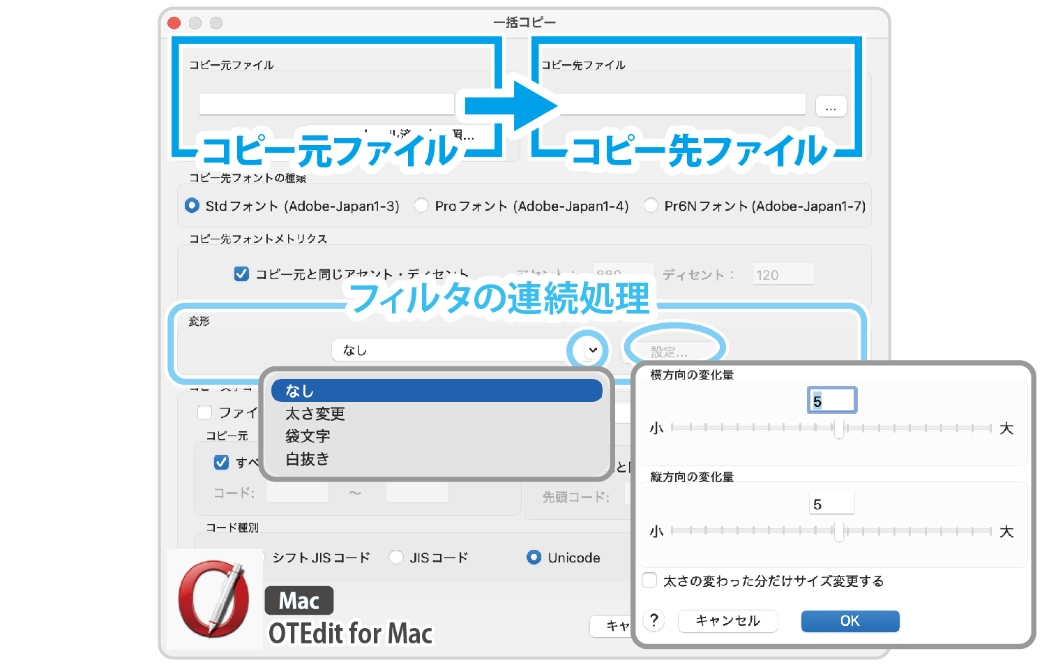 OTEdit for Windowsにあるフィルタを連続適用できます。太字/細字/袋文字/白抜きで選択可能。全文字指定なので「ファイルで指定」用リスト不要。