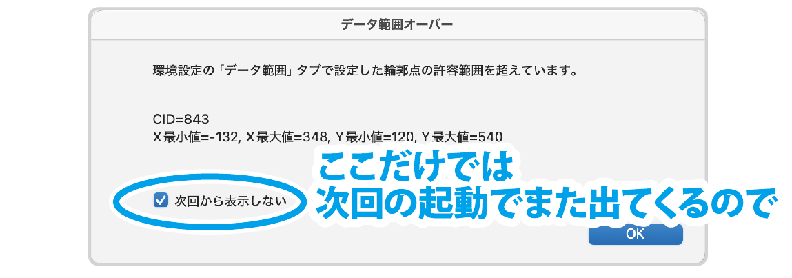 ・OTEdit for Macの初回の保存で出てくる「データ範囲オーバー」のウインドウを出ないようにしておく。