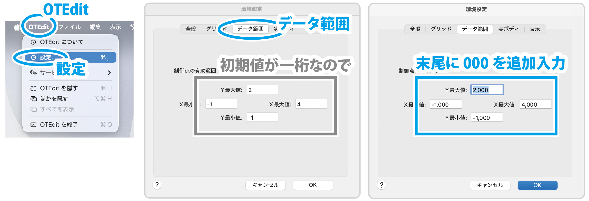 「OTEdit」-「設定」、環境設定パネルの「データ範囲」で初期値がなぜか一桁なので公式ヘルプに合わせて000を追加して、データ範囲の許容を広げておく。(グリフ枠より大きければ他の数値でもOK)。一度設定すれば次回のOTEditの起動でも数値は引き継ぎされます(が、OTEditが落ちると消えてるような?)。