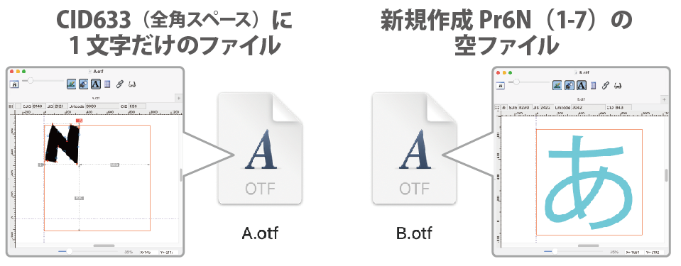 ●ファイルを2つ用意します。OTEditで新規ファイルを作成、CID633(全角スペース)にN字のダミーオブジェクトを書き込み、ファイルを(A.otf)と言う名前で保存して閉じます。新規ファイルをPr6N(1-7)で作成、空のまま(B.otf)と言う名前で保存して閉じます。