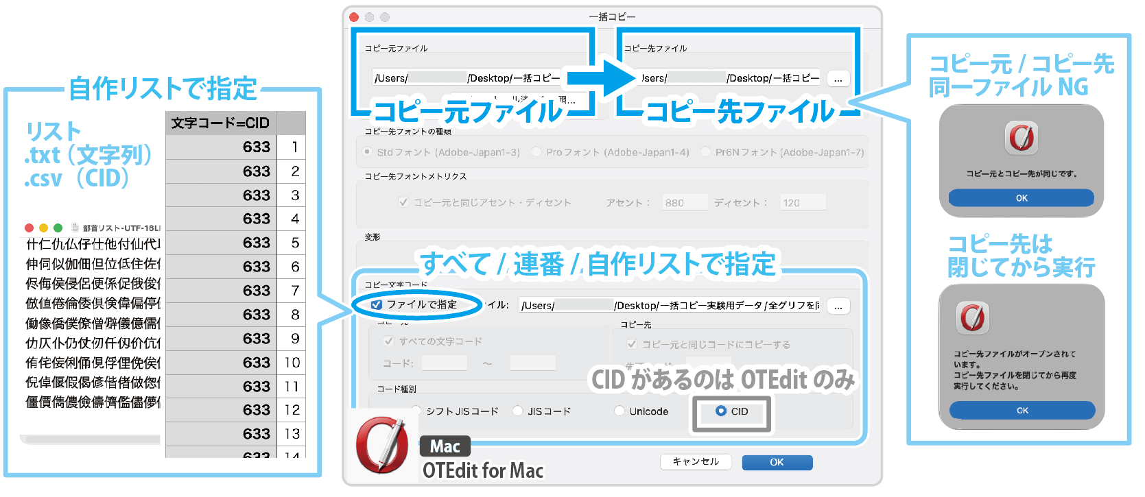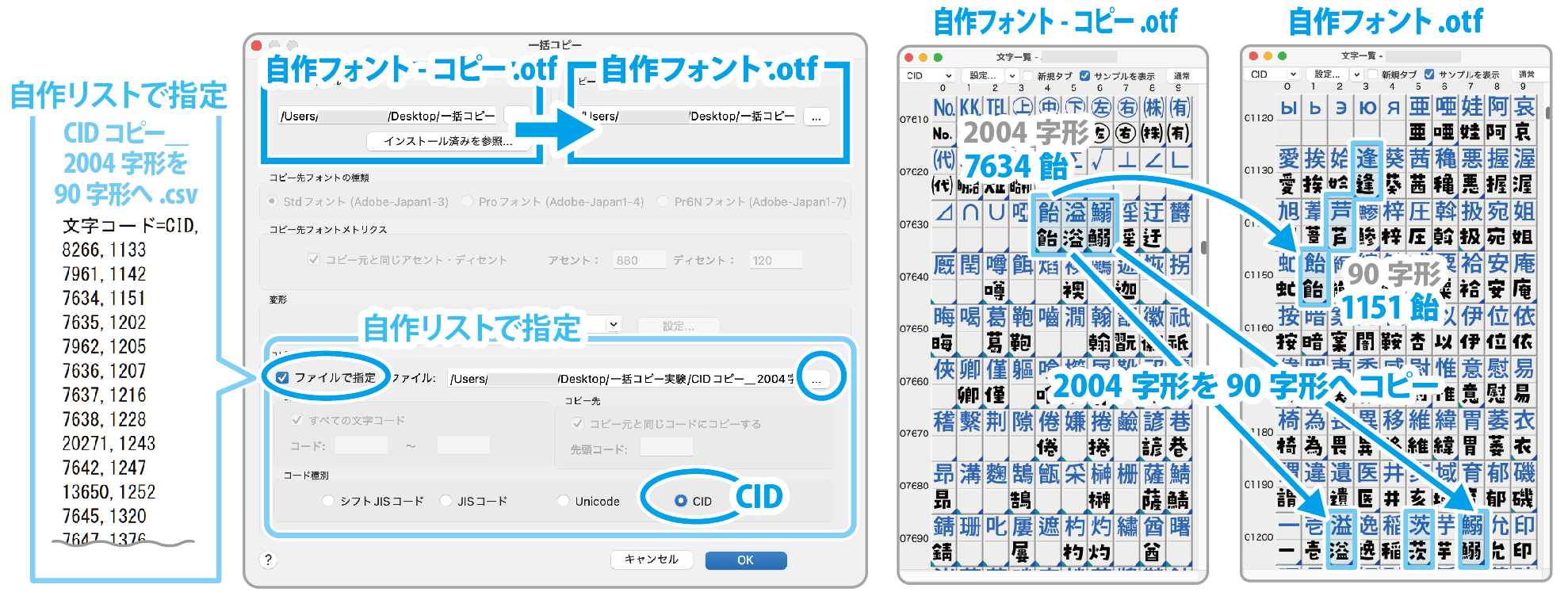「ファイルで指定」にチェック、『CIDコピー_2004字形を90字形へ.csv』または『CIDコピー_90字形を2004字形へ.csv』リストを指定します。コード種別:CIDを選択。「OK」で一括コピー開始。