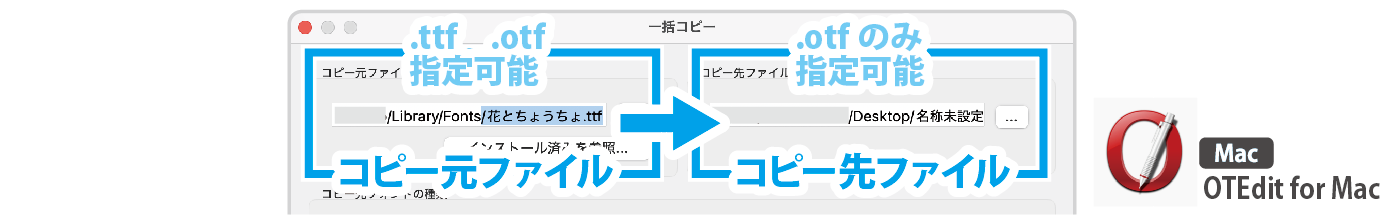 コピー元ファイル(A.otf)/コピー先ファイル(B.otf)を指定します。(コピー先ファイルをクリックしてコピー、入力欄にペーストで入力し、「置き換えてもよろしいですか?」は「置き換え」する。)