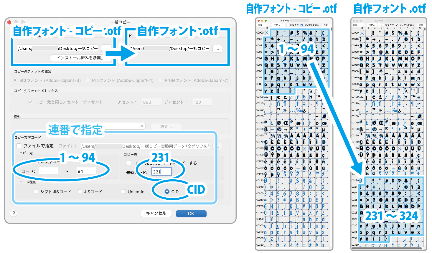 以下のような連番→開始位置が異なる連番のコピーも出来ると思います。シフトJIS/Unicode/CID番号いずれかを調べて指定。
