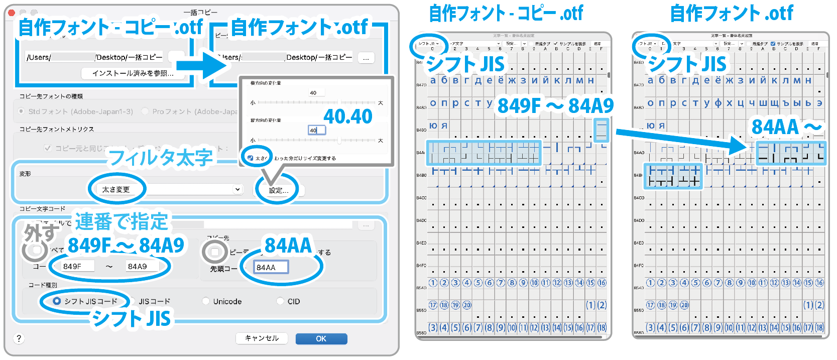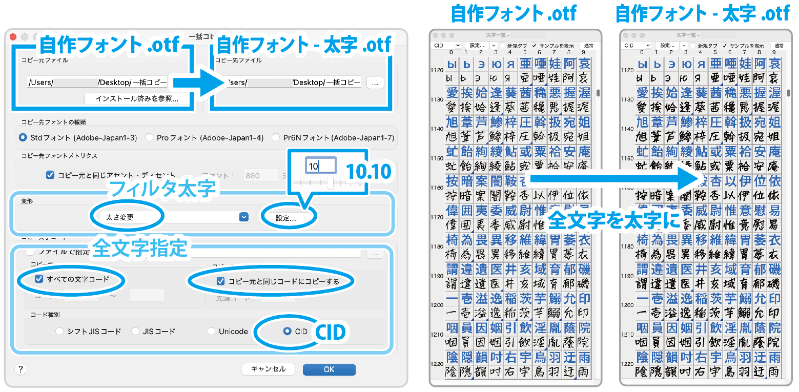 「変形」で「太さ変更」、「設定」で変化量数値10・10を入力。「全ての文字コード」にチェック。「コピー元と同じコードにコピーする」にチェック。コード種別:全文字対象なのでCIDに。「OK」で一括コピー開始。