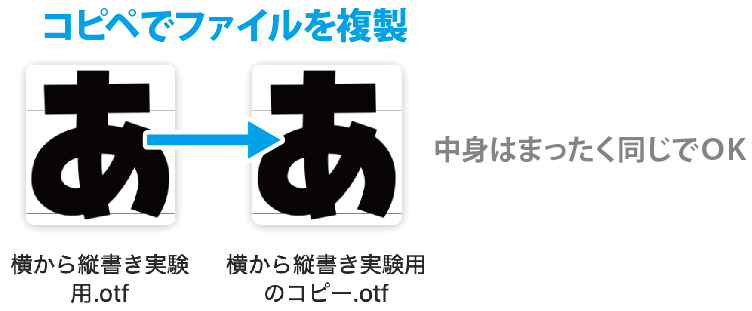 ●横書きグリフを埋めてある自作フォントファイルを用意します。コピー元/コピー先には同一ファイルを指定出来ないため、デスクトップ上などでコピー&ペーストし、複製ファイルを用意します。
