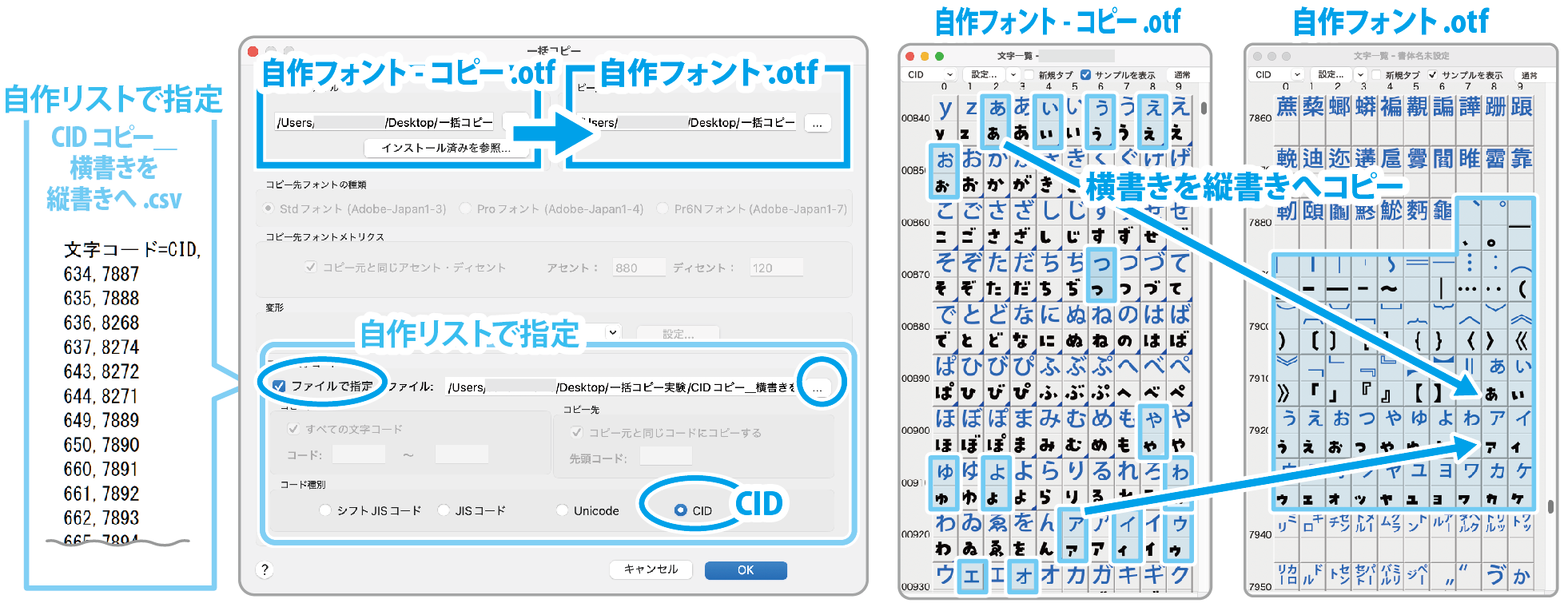 「ファイルで指定」にチェック、『CIDコピー_横書きを縦書きへ.csv』リストを指定します。コード種別:CIDを選択。「OK」で一括コピー開始。