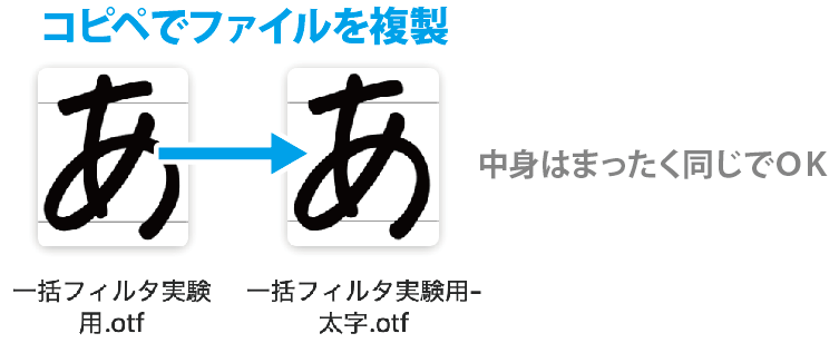 ●すでに出来ている自作フォント(自作フォント.otf)を用意します。コピー元/コピー先には同一ファイルを指定出来ないため、デスクトップ上などでコピー&ペーストし、(自作フォント-太字.otf)という名前の複製ファイルを用意します。