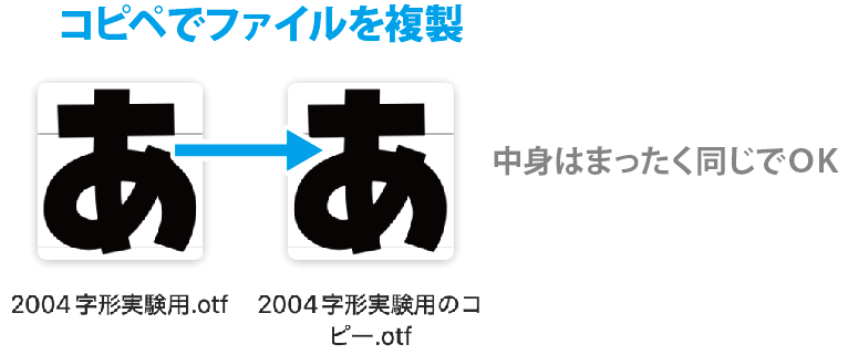 ●2004字形または90字形を埋めてある自作フォントファイルを用意します。コピー元/コピー先には同一ファイルを指定出来ないため、デスクトップ上などでコピー&ペーストし、複製ファイルを用意します。