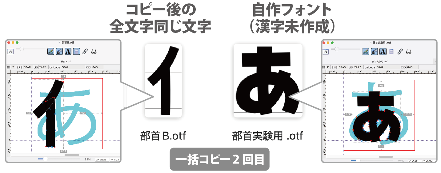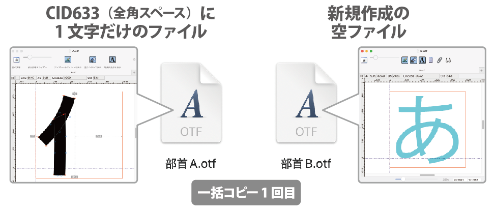 ●ファイルを2つ用意します。コピー後の全同じオブジェクトの(部首B.otf)。漢字を未作成の自作フォントファイル。
