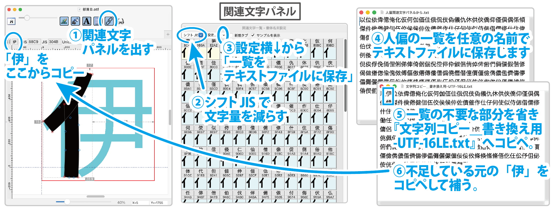 ●部首リストを用意します。『文字列コピー_書き換え用-UTF-16LE.txt』をテキストエディットで開き、人偏リスト(例:休体件伊…)など任意に書き換え保存しておきます。画像は関連文字パネルからの部首リストの内容の取得方法です。OTEdit for Windows用の自作マクロの他のリストの取得方法も読んで下さい。