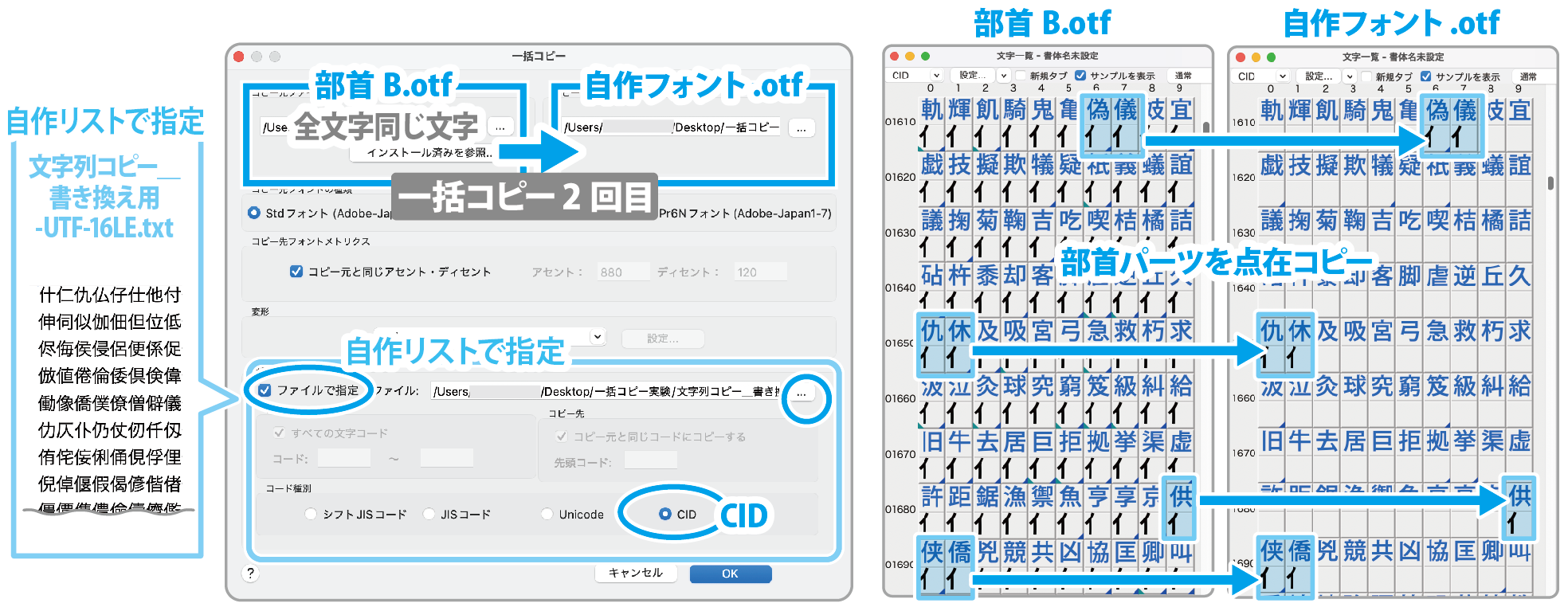 コピー元ファイル(部首B.otf) /コピー先ファイル(自作フォント.otf)を指定します。「ファイルで指定」にチェック、『文字列コピー_書き換え用-UTF-16LE.txt』を指定します。コード種別:CIDを選択(Unicodeでもいいかも?テキストファイルで表現できる文字=Unicode範囲です)。「OK」で一括コピー開始。