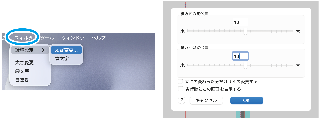 ●自作フォント.otfを開き、任意の一文字にフィルタで太字をかけてみて、環境設定の希望の数値を覚えておきます。保存せずに閉じる。