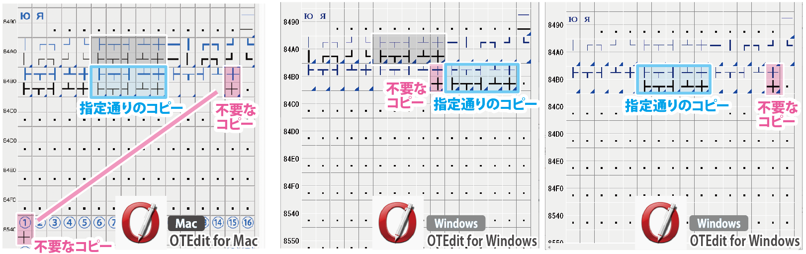 ・OTEdit製ではないフォント(TTEditから・他社製のフォントから)からのコピーは縦書き・罫線素片などの向きがずれたり、プロポーショナル幅が失われたり、文字数が合わなかったりします。