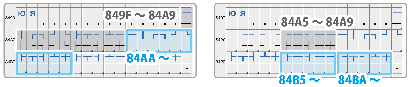 ・文字一覧をシフトJIS順にして罫線素片エリアの前半11字(シフトJIS:849F~84A9)を埋めると、この後の11字(横線から十字)・5字・5字(ト型から十字)の繰り返しのコピー元として使えます。