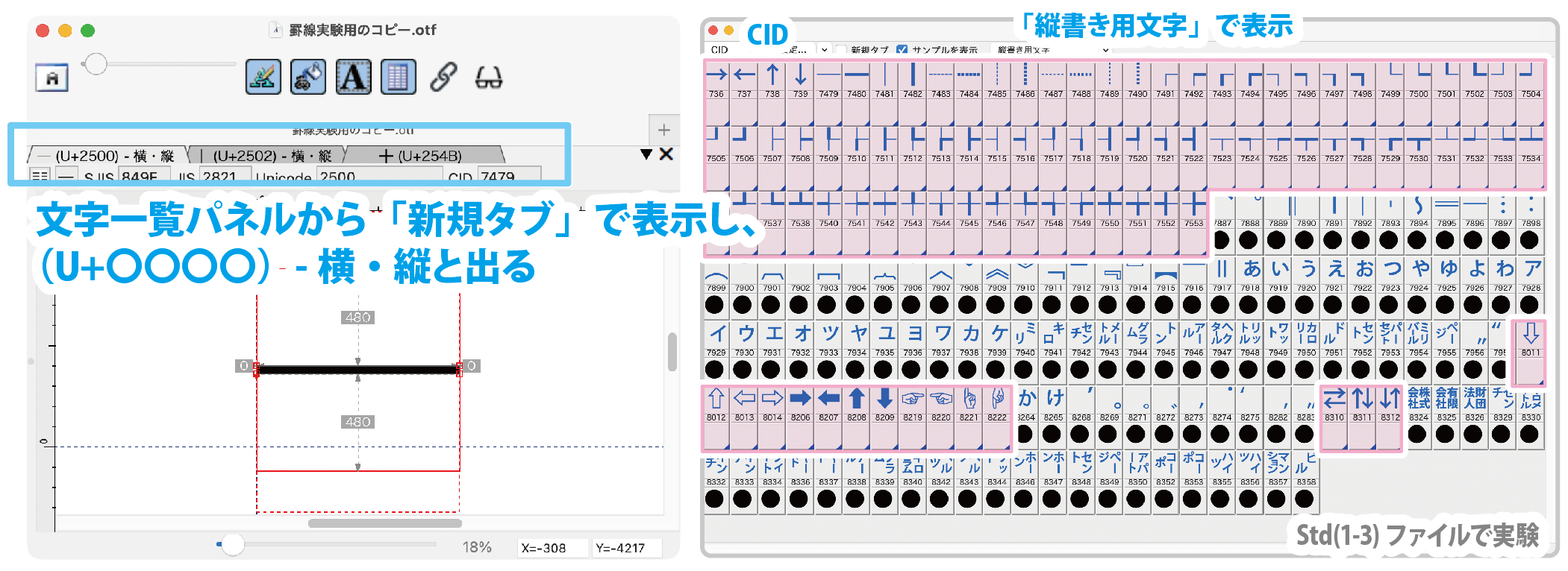 シフトJIS連番指定で罫線素片(─│┌┐┘└├┬┤┴┼)のコピーをしたところ、結果にバグが起きやすいエリアかもしれません。OTEdit for MacでもOTEdit for Windowsでも問題が出ます。記録用に残しておきます。